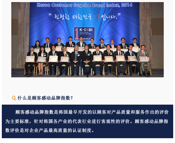 顧客感動品牌指數(shù)是由韓國產(chǎn)業(yè)商務支援部的附屬企業(yè),韓國品牌經(jīng)營協(xié)會發(fā)表的指數(shù)評價.評價標準以產(chǎn)品的質(zhì)量和服務使顧客感動為基礎,對各產(chǎn)業(yè)中的代表行業(yè)進行客觀性的評選。顧客感動品牌指數(shù)評價的認證制度是針對全國 20~59歲的1600名消費者所感動的 4個因素(原因、情況、高興、熱情)進行評價,評選出相應指數(shù)。