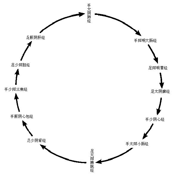正如前述,經(jīng)絡(luò)中氣血的流通是機(jī)體生存的根本基礎(chǔ)。而經(jīng)脈是運(yùn)行氣血的經(jīng)路,而氣血的運(yùn)行是按一定的次序流注的,十二正經(jīng)脈的循環(huán)(大循環(huán))是從手太陰肺經(jīng)開始,一次傳至足厥陰肝經(jīng),再流注手太陰肺經(jīng),首尾相連,“陰陽想貫,如環(huán)無端”。